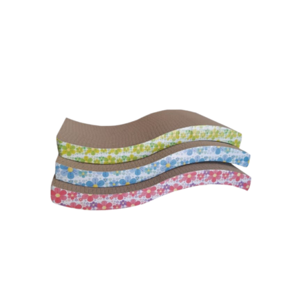 Rascador de piso para gatos, fabricado en cartón corrugado resistente. Incluye bolsita de hierba gatera (catnip) para atraer al gato