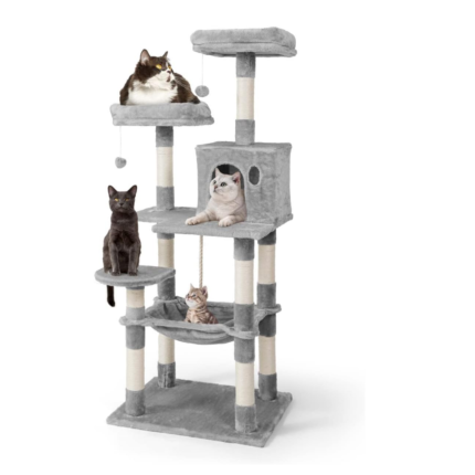 Torre rascadora para gatos de 5 niveles, ideal para hogares con uno o más gatos. Incluye hamaca y casita, ofreciendo
