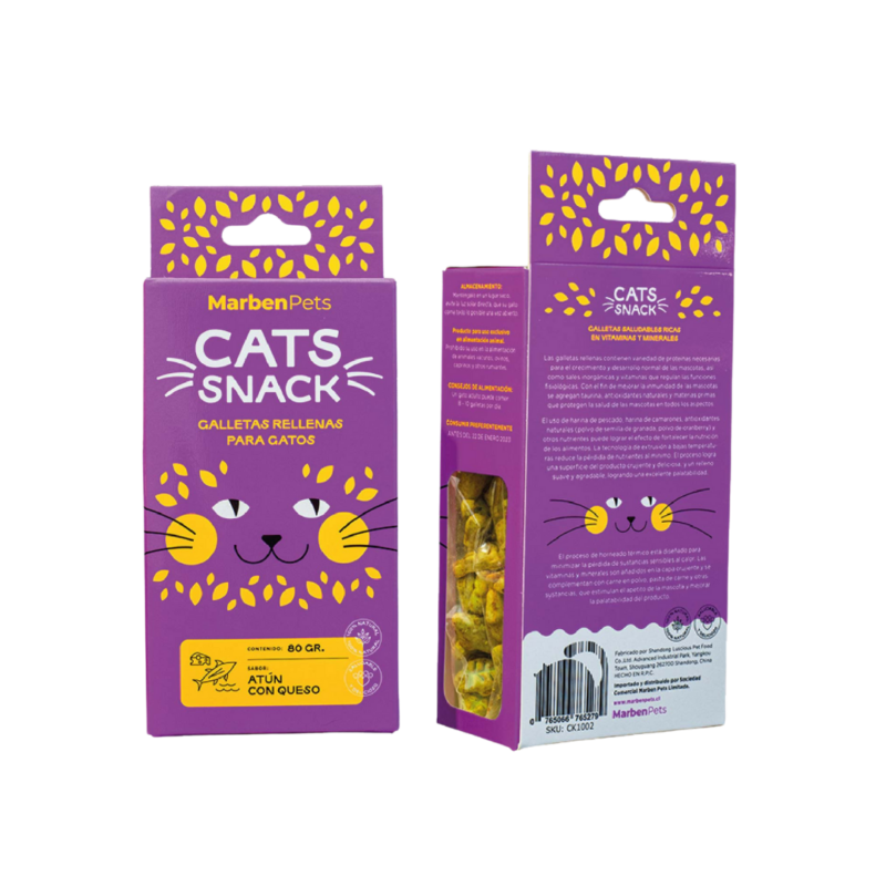 Galletas Rellenas de Atún con Pollo mezclan dos proteínas altamente nutritivas y sabrosas para los felinos. El atún, rico en