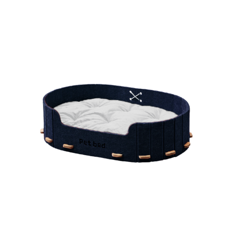 La cama de fieltro con colchoneta azul marino combina diseño elegante con funcionalidad. Su base firme y colchoneta acolchada brindan