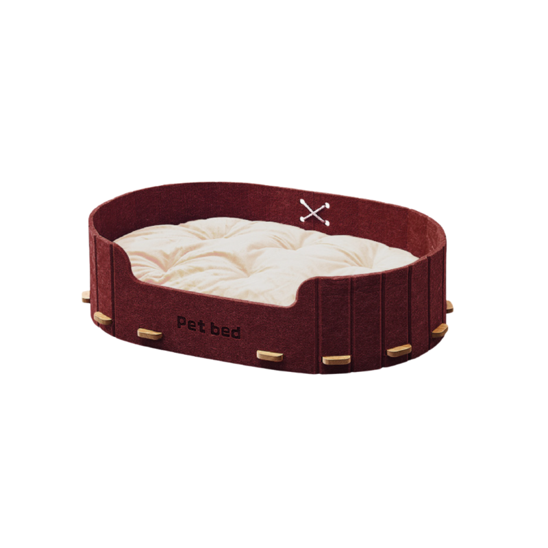 La cama de fieltro con colchoneta roja está diseñada para brindar soporte, confort y resistencia. Su estructura sólida y colchoneta