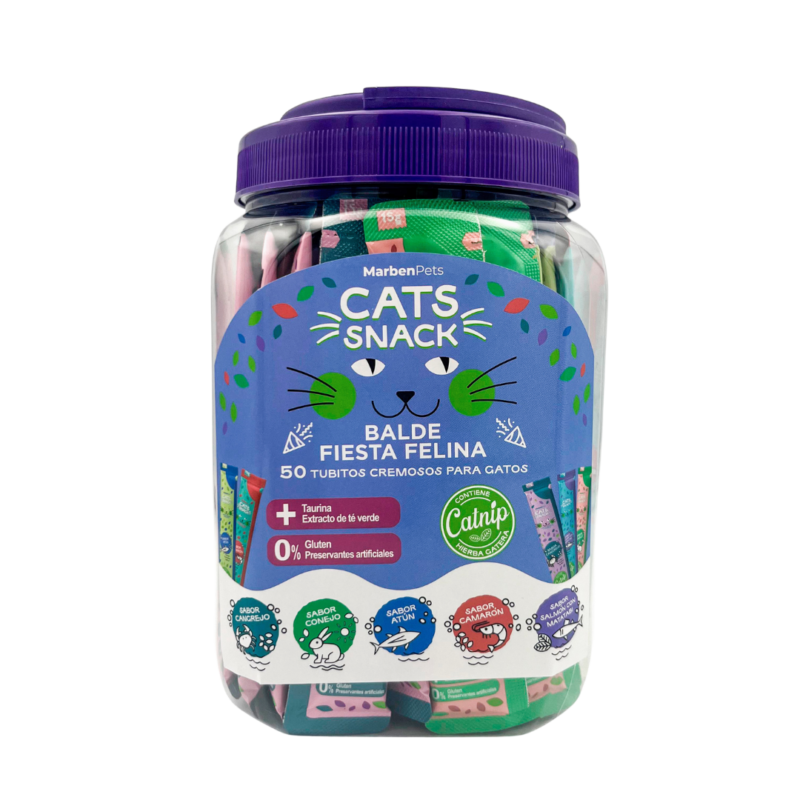 Balde de snacks cremosos para gatos con 50 unidades surtidas. Incluye variedad de sabores en un solo formato práctico, ideal para mayor rendimiento, organización y conveniencia en el punto de venta o consumo frecuente.