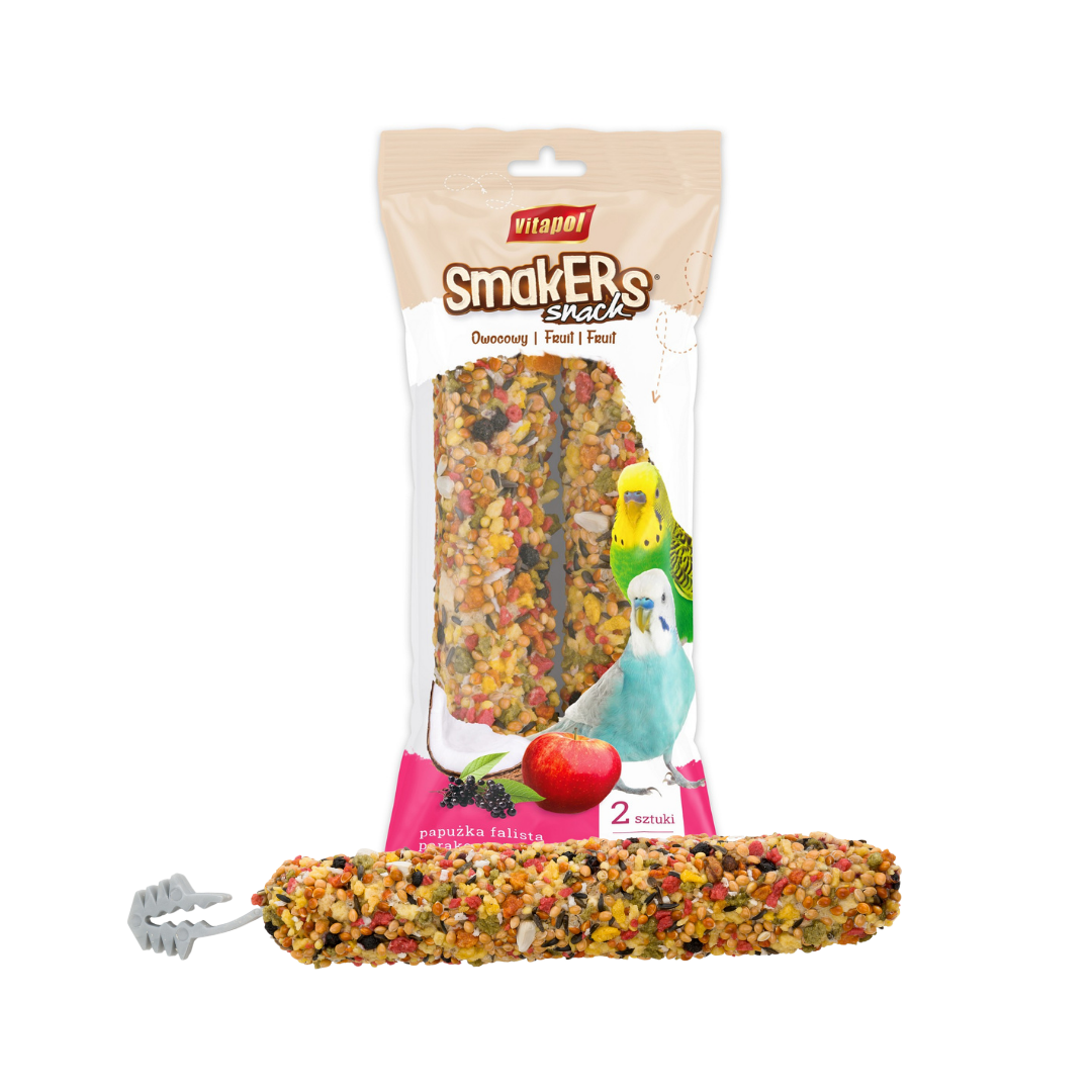 Smakers en bolsa para aves con frutas, un snack natural y nutritivo ideal para canarios, periquitos y aves pequeñas. Elaborado con una mezcla de semillas seleccionadas y frutas deshidratadas, aporta vitaminas, minerales y energía, ayudando a complementar la alimentación diaria y estimular el comportamiento natural de picoteo.