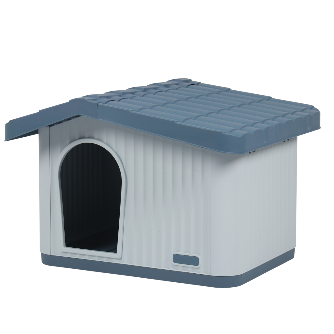 Casa para perro plástica color azul, resistente a rayos UV y con techo impermeable inclinado. Incorpora ventilación trasera y patas antideslizantes para mayor estabilidad. Ideal para proteger a tu mascota del sol, la lluvia y cambios de clima en exteriores.