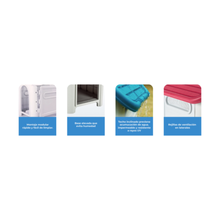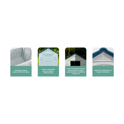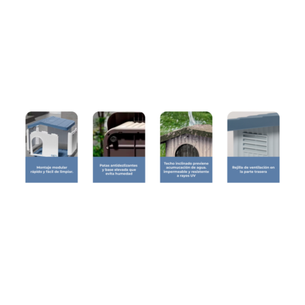 Su techo inclinado e impermeable facilita el escurrimiento del agua, evitando acumulaciones, mientras que la ventilación trasera permite una adecuada circulación de aire para mantener el interior fresco y seco. Su estructura firme incluye patas antideslizantes que aportan mayor estabilidad en distintas superficies.