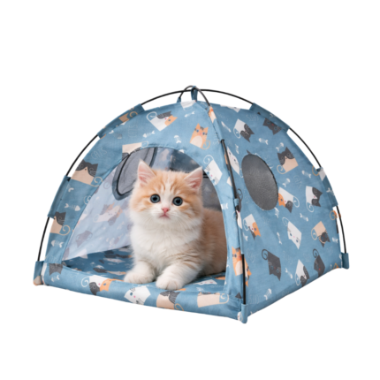 Carpa plegable para gatos, liviana y fácil de armar, con ventilación y diseño portátil. Ideal para descanso y transporte.
