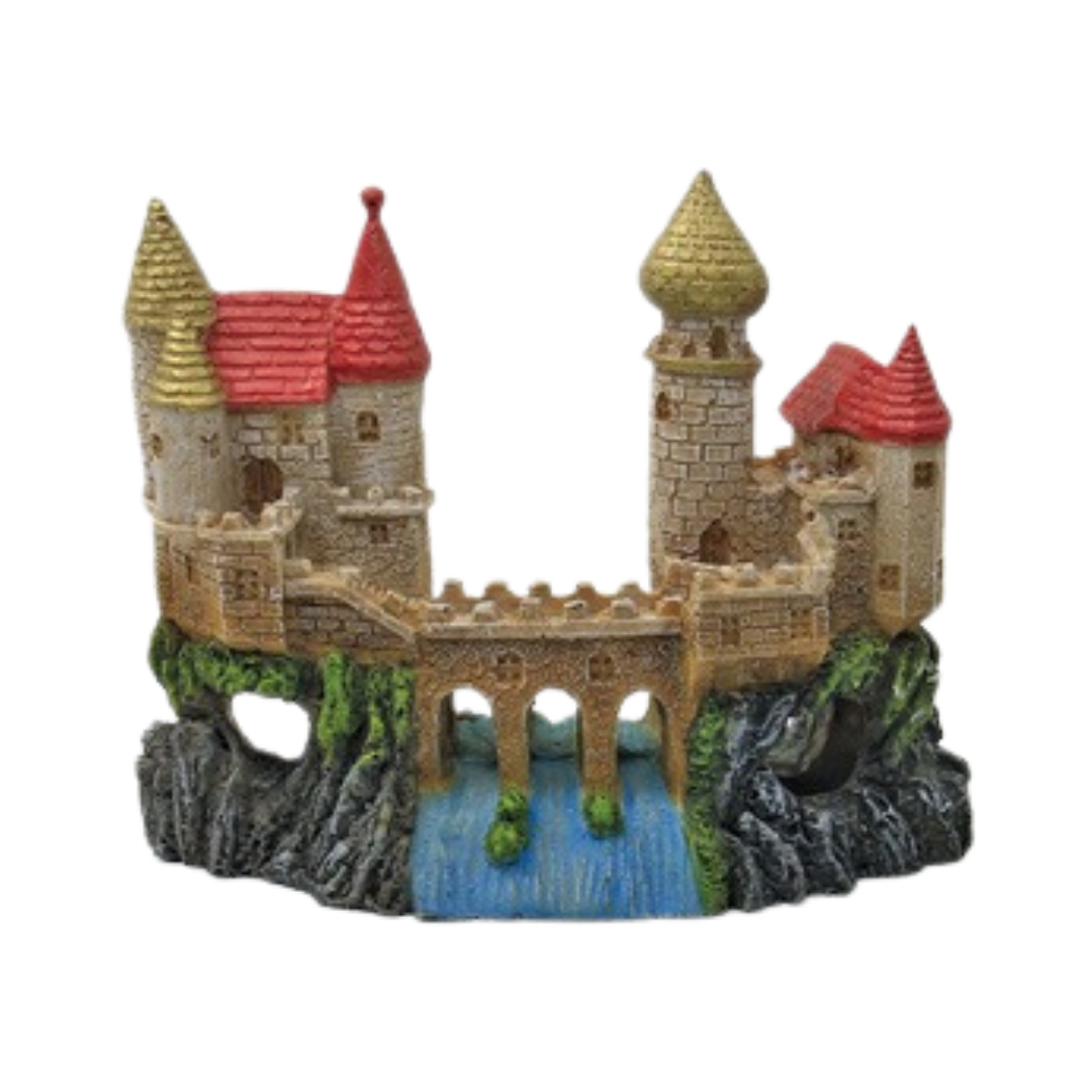 Castillo decorativo con cascada para acuario, diseñado para aportar movimiento visual y estilo. Ideal para acuarios pequeños y medianos, ofrece escondites y mejora la estética general.