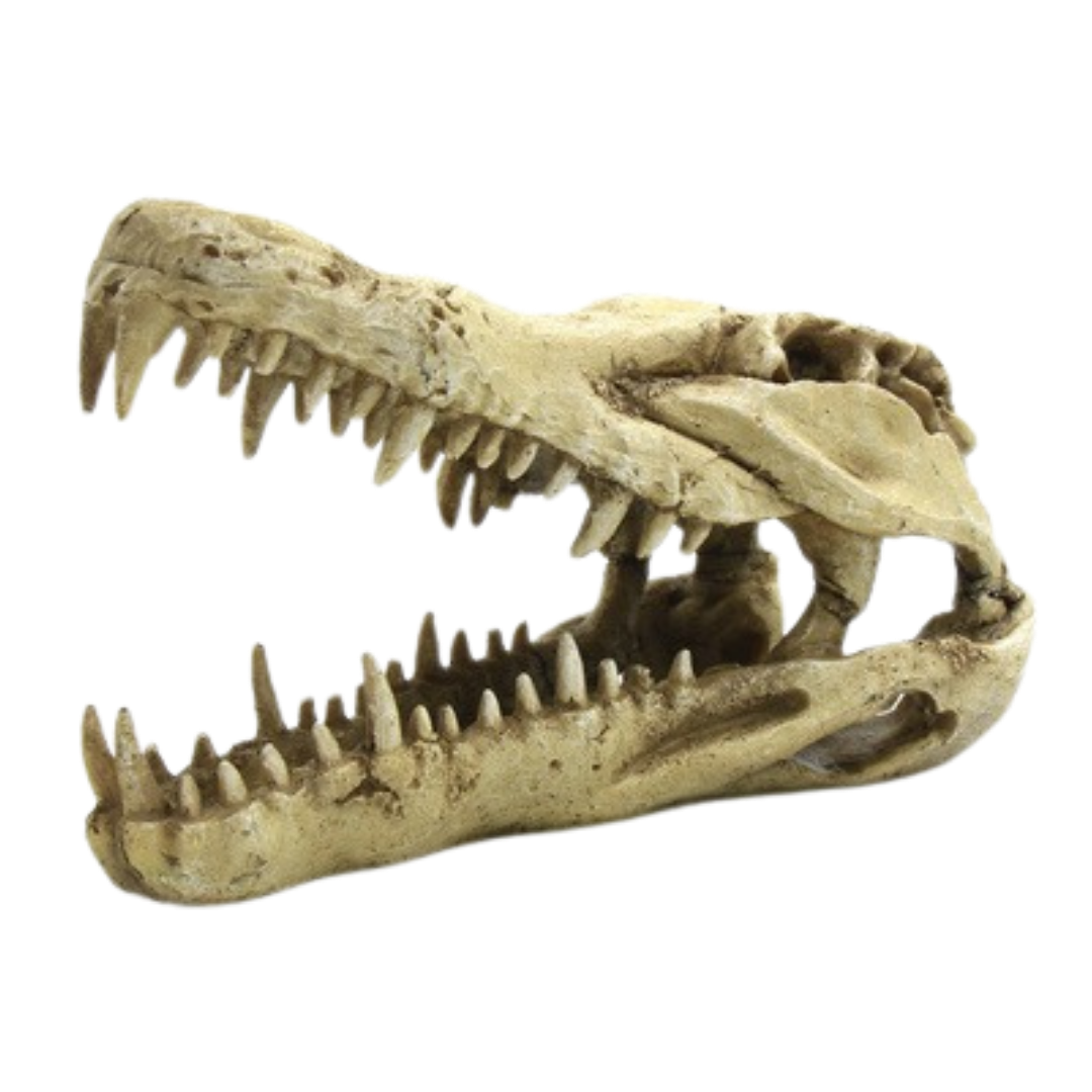 Craneo de dinosaurio decorativo para acuario, ideal para acuarios temáticos y de fantasía. Aporta un diseño impactante y sirve como refugio para peces. Material resistente, no tóxico y apto para agua dulce.