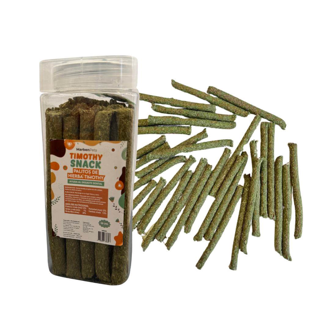 Palitos de hierba Timothy para roedores y conejos, ideales para el desgaste dental diario y una digestión saludable. Elaborados con Timothy natural, ricos en fibra y sin aditivos artificiales. Su formato en palitos facilita el consumo y promueve el entretenimiento y bienestar de las mascotas.