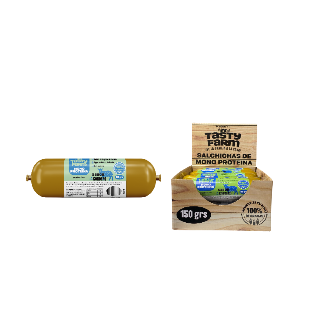 Salchichas de Cordero Monoproteicas TastyFarm son un snack nutritivo elaborado con cordero como única fuente de proteína, ideal para perros activos que necesitan un refuerzo energético y una alimentación equilibrada. Ricas en proteínas y grasas saludables, ofrecen un aporte natural que favorece la vitalidad y el bienestar diario. Disponibles en formato unitario, display y embalaje.