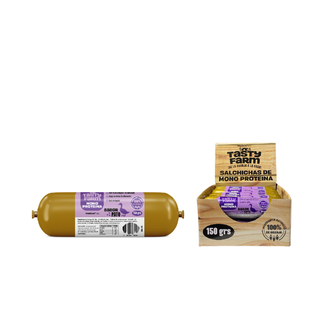 Salchichas de Pato Monoproteicas TastyFarm ofrecen un sabor exótico y fácil de digerir, ideal para perros con sensibilidades alimentarias o paladares más exigentes. Elaboradas con pato como única fuente de proteína, aportan nutrición de calidad y una excelente tolerancia digestiva. Disponibles en formato unitario, display y embalaje.