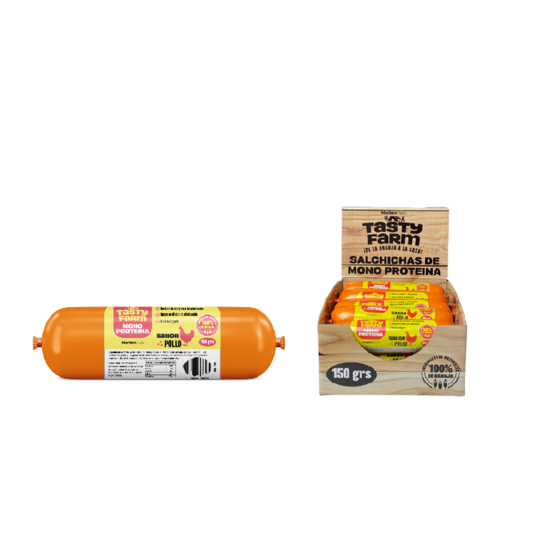 Salchichas de Pollo Monoproteicas TastyFarm están elaboradas con pollo como única fuente de proteína, lo que las convierte en un snack ideal para perros de todas las edades. Ricas en proteínas magras, ayudan al desarrollo muscular y aportan la energía necesaria para el día a día. Su excelente digestibilidad las hace perfectas como premio, snack o complemento nutricional. Disponibles en formato unitario, display y embalaje.