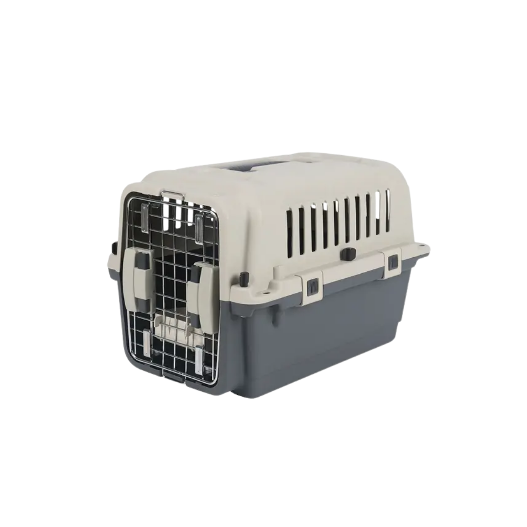 Transportadora Kennel XS para perros y gatos, certificada IATA, ideal para viajes en avión. Fabricada en polipropileno ecológico de alta resistencia. Incluye ruedas, ventanas de acero, doble manilla y bowls, garantizando seguridad, estabilidad y comodidad para la mascota.
