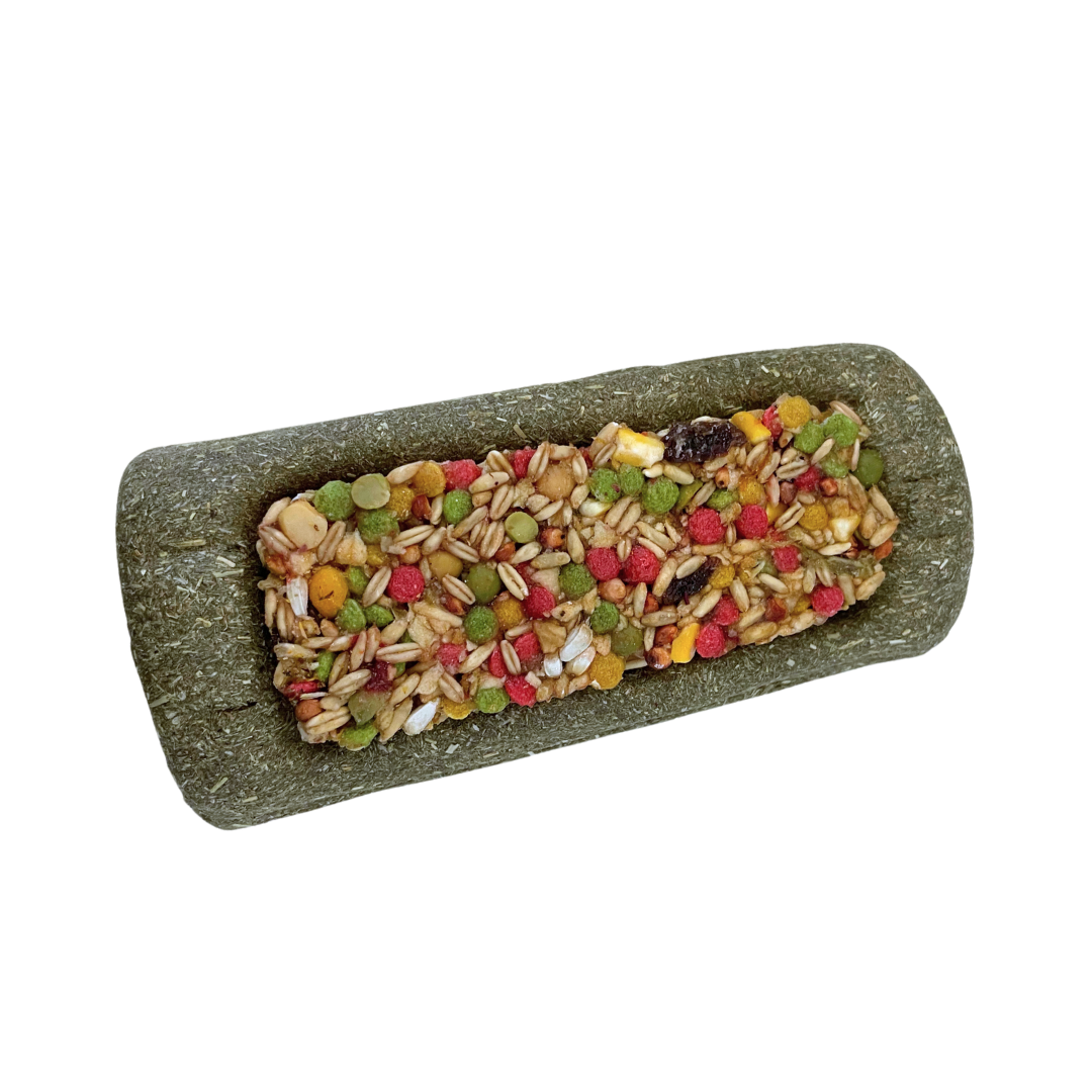 Tronco de Timothy natural para roedores y conejos, diseñado para favorecer el desgaste dental natural y mantener dientes sanos. Elaborado con heno Timothy prensado y semillas, aporta fibra esencial y estimula el comportamiento natural de roer. Ideal como snack funcional y elemento de enriquecimiento para la jaula.