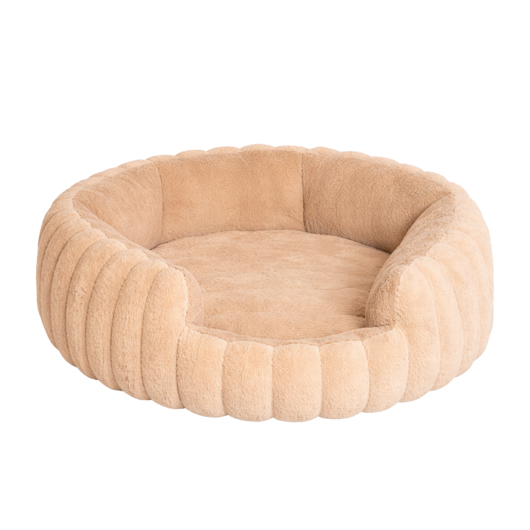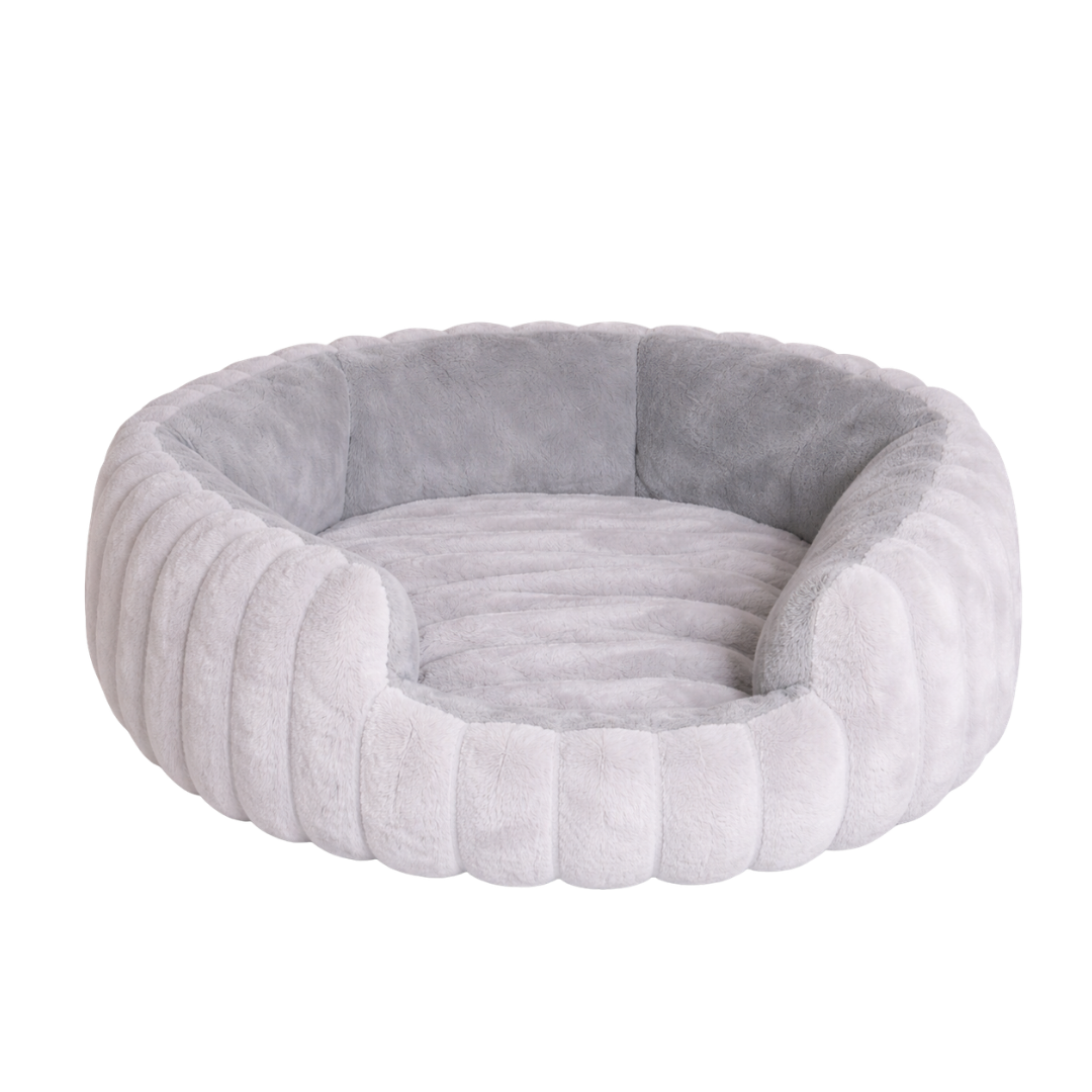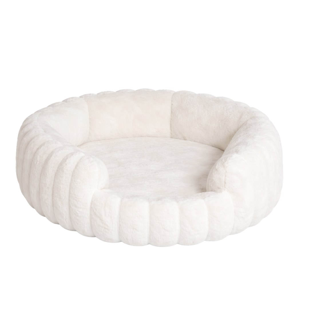 Fabricada con tela de poliéster, algodón PP y piel de conejo sintética, ofrece una textura extremadamente suave al tacto, ideal para mascotas que buscan calidez y comodidad. Su interior cuenta con relleno de espuma triturada, proporcionando un soporte adecuado que ayuda a mantener una postura cómoda durante el descanso.