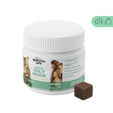 Suplemento nutricional funcional formulado para apoyar la salud de la piel y el pelaje en perros. Contiene aceite de salmón, biotina, zinc y MSM (Metilsulfonilmetano), contribuyendo a un pelaje más fuerte, brillante e hidratado.