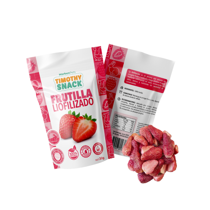 Snack liofilizado de frutilla para mascotas, elaborado con frutilla 100% natural. Fuente de vitamina C, antioxidantes y fibra, ayuda a