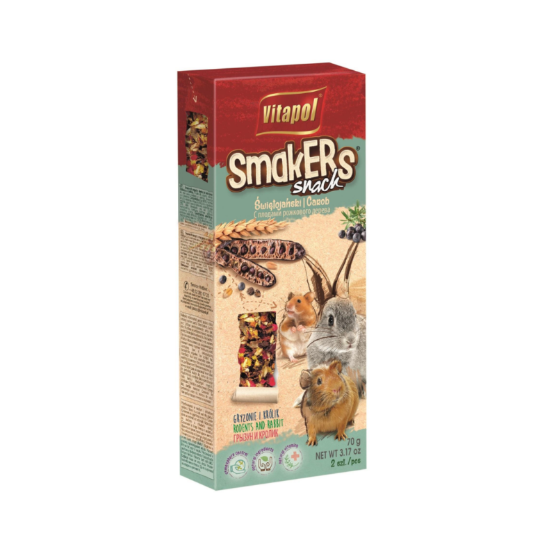 Smakers para pequeños animales sabor algarrobo, snack natural y nutritivo ideal para roedores y conejos. El algarrobo aporta energía natural,