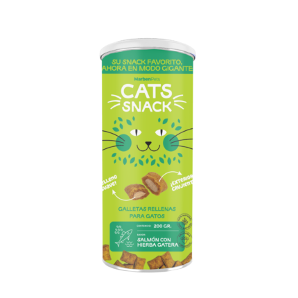 Galletas rellenas para gatos con salmón y hierba gatera en formato maxi 200g. Crujientes y aromáticas, estimulan sus sentidos mientras aportan proteínas y omega-3.