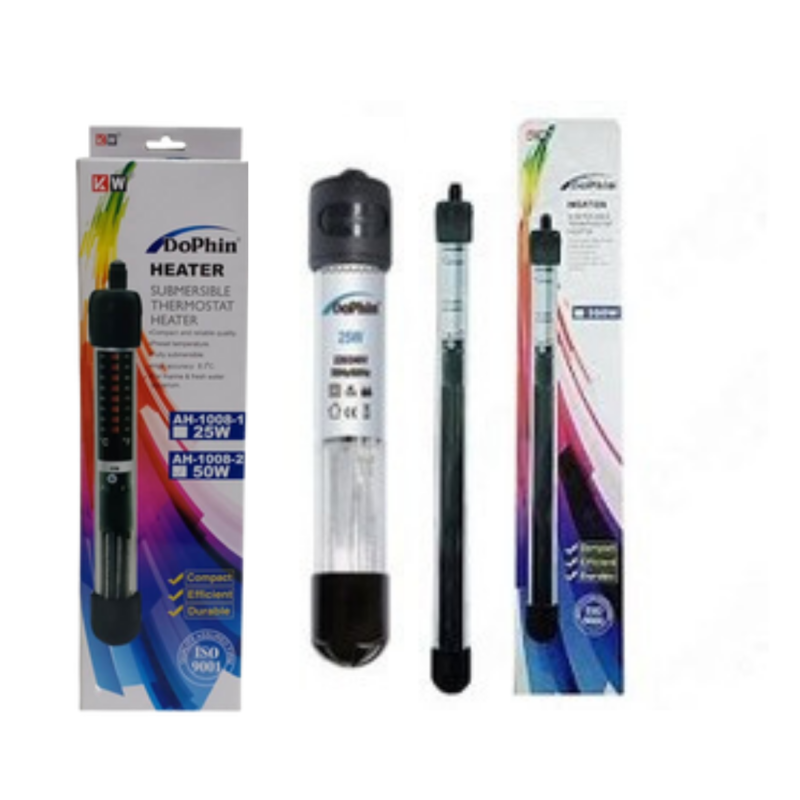 Termocalentador Dophin para acuarios, diseñado para mantener una temperatura constante y segura. Ideal para acuarios tropicales, con control térmico confiable