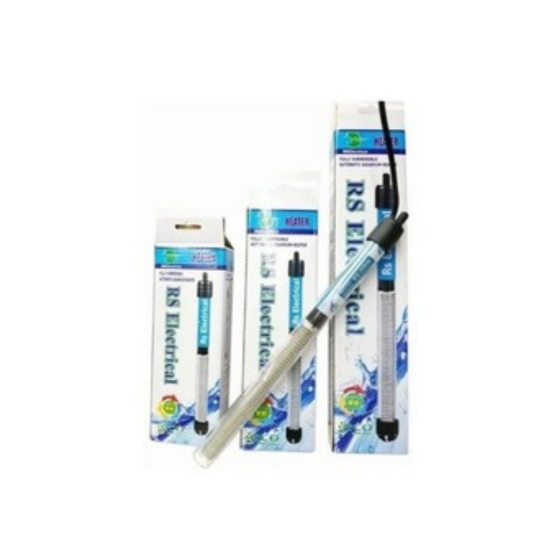 Termocalentador de vidrio RS para acuarios, ideal para mantener el agua a la temperatura adecuada en acuarios medianos y grandes.
